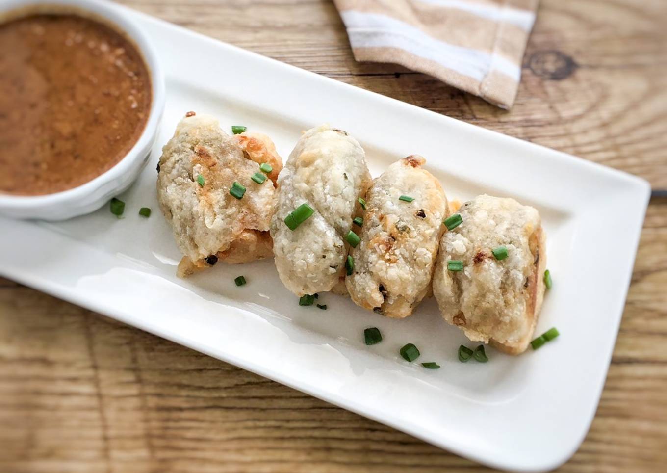 - Secukupnya tahu putih - 10 sdm tepung sagu - 1 sdm tepung terigu - 1/2 sdt garam - 1/4 sdt kaldu bubuk - 1 sdt bawang putih bubuk - 1 bh daun bawang diiris - 80-100 ml air panas mendidih - Secukupnya tepung sagu untuk pelapis