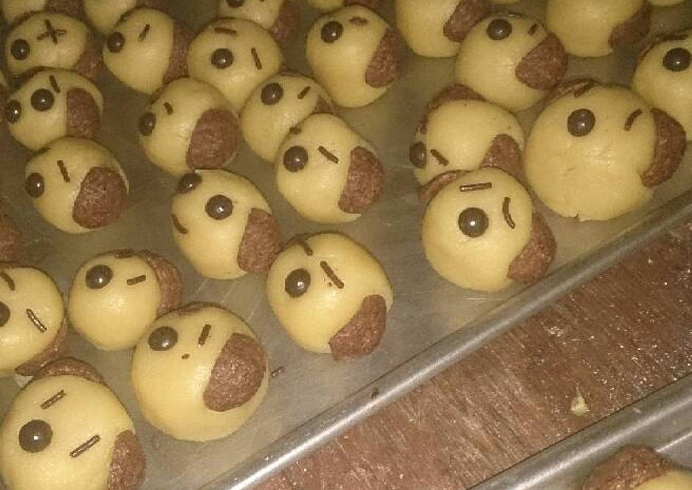 - Ambil adonan secukupnya, pipihkan, masukkan selai nanas, kemudian bulatkan. setelah itu pasang choco rilas di kedua sisi nastar sebagai telinga, ceres untuk mata, choco cips untuk hidung. buat hingga adonan habis