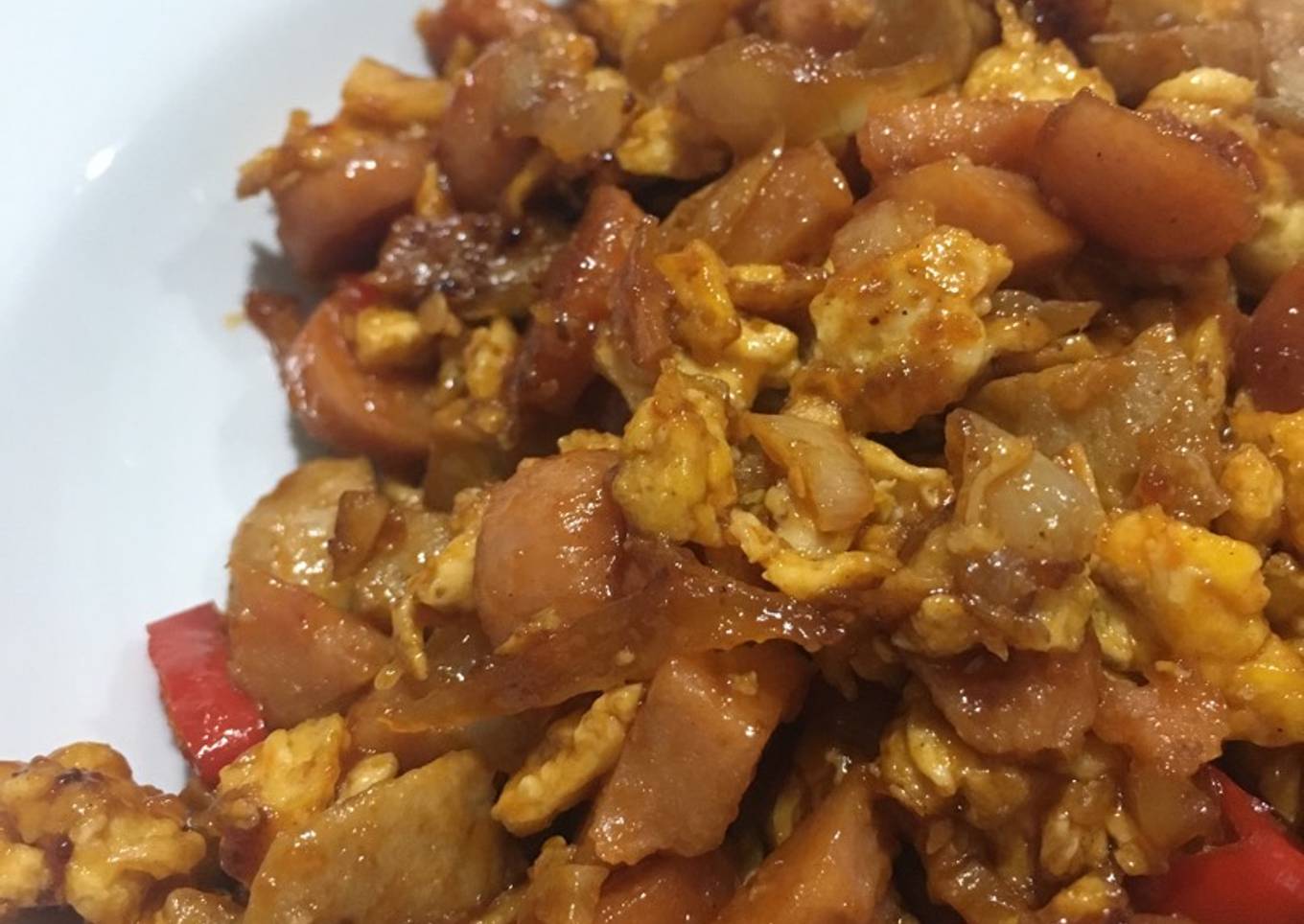 - Campurkan bawang dan telur yg sdh di orak arik. Masukkan cabe, tumis. Masukkan bakso, sosis, ham ke dlm teflon. Stlh mulai matang, masukkan saus tomat, saos tiram, sambal, kecap manis, garam, gula, lada dan kaldu jamur