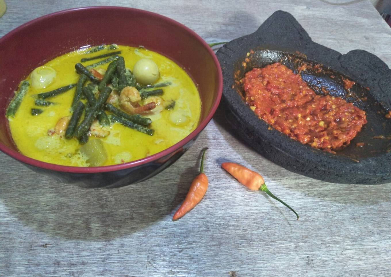 - 250 Gr udang - 15 butir telur puyuh - 10 lonjor kacang panjang - 2 lembar daun salam - 2 Cm lengkuas - 500 ml santan dari ½ butir kelapa - Bumbu halus: - 7 buah bawang merah - 4 siung bawang putih - 1 cabe merah (resep aslinya 10) - 2 Cm kunyit - Secukupnya ebi kering (rendam, lalu tiriskan)
