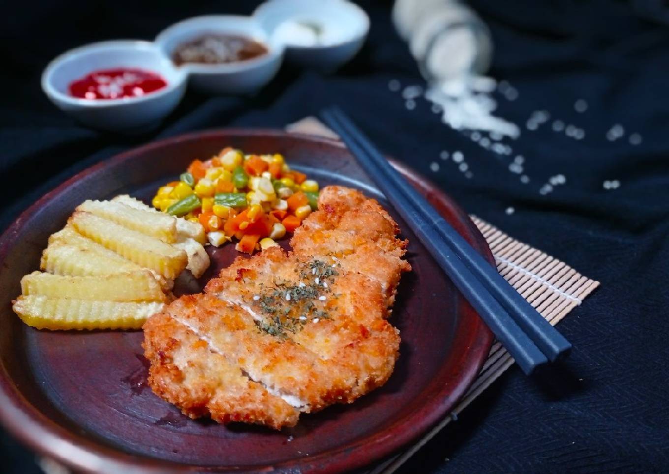- Sajikan dengan sayuran kukus, kentang goreng/nasi, saus. Disini saya pakai saus tomat/sambel, mayo, saus lada hitam. Resep saus lada hitam : https://cookpad.com/id/resep/13935235-saus-lada-hitam-black-pepper-sauce?invite_token=P2hPSSF2x7qoXbozCAEMpoAt&shared_at=1603874244